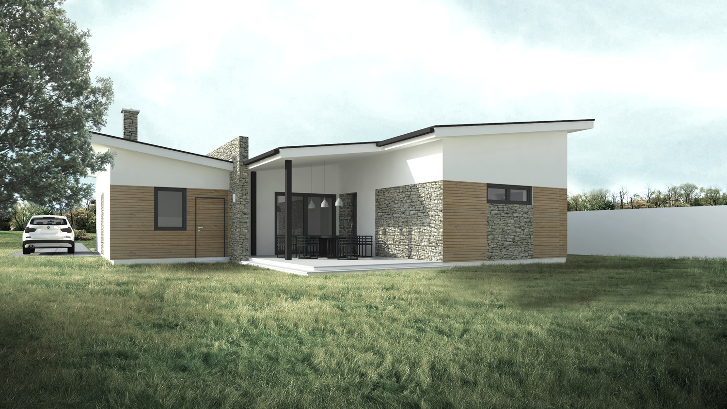 Projekt 4 izbového moderného bungalovu pre 4 5 člennú rodinu s čiastočne zastrešenou terasou